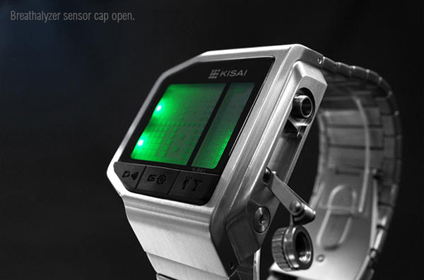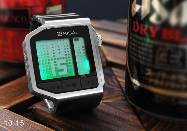 但現在,手錶品牌 KISAI 真的推出了一款可以酒測的手錶,很明顯的與想像中的手錶有點不同,再這隻手錶上面你找不到吹管,它使用的是感應的方式檢測酒精濃度,當你向著手錶吹氣五秒鐘,手錶會自動捕捉你呼吸吐出的空氣中含有多少酒精,並且顯示在手錶的螢幕上。