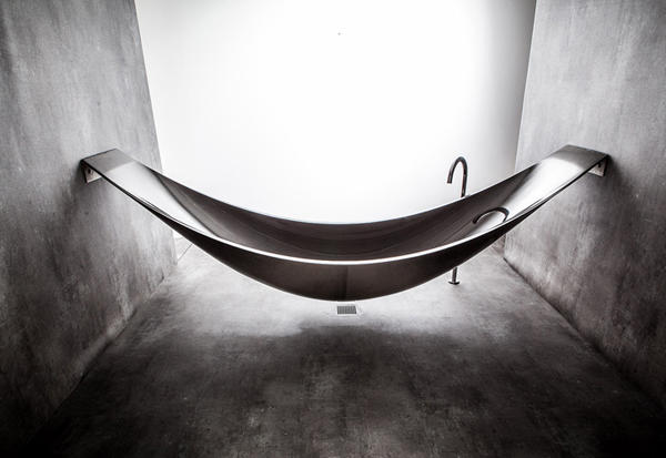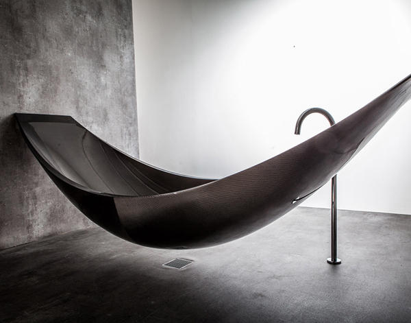 設計工作室 Splinter Works 最近釋出一款與我們印象中天差地遠的浴缸設計,看起來超級不穩的吊床浴缸,其實是用堅固的碳纖維製作而成,完全離地的設計讓浴缸不再是浴室髒污的死角。