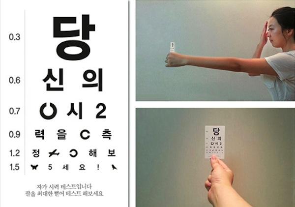 這間眼鏡行位於濟州島鄉下,附近的居民多為年齡稍長的婆婆媽媽、叔叔伯伯,而他們大多都不承認也不在意視力不足的問題。因此設計師便針對這個特點,將名片設計成視力檢查表的造型,以有限的預算完成了這款實用新奇的創意名片。收到名片後,只要照著簡單的步驟操作,就能替自己做個簡易的視力檢查。當然這樣的檢測是一點都不精確的,不過卻是讓老們人家們不得不承認自己的視力衰退的問題。
