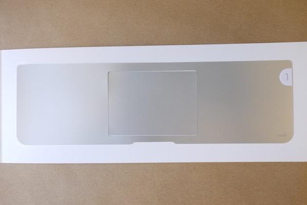 大多數人們使用筆電時都會將手腕置在觸控板的左右兩側,這塊區域是整台電腦中最常與人體接觸的地方,為了將電腦保持的漂漂亮亮,所以Moshi也推出了易潔手墊貼來保護你心愛的電腦。這塊手墊貼最大的特色在於顏色與原本的MBA相當接近,更重要的是摸起來的觸感好的沒話說,完全不輸原本的鋁質外殼。