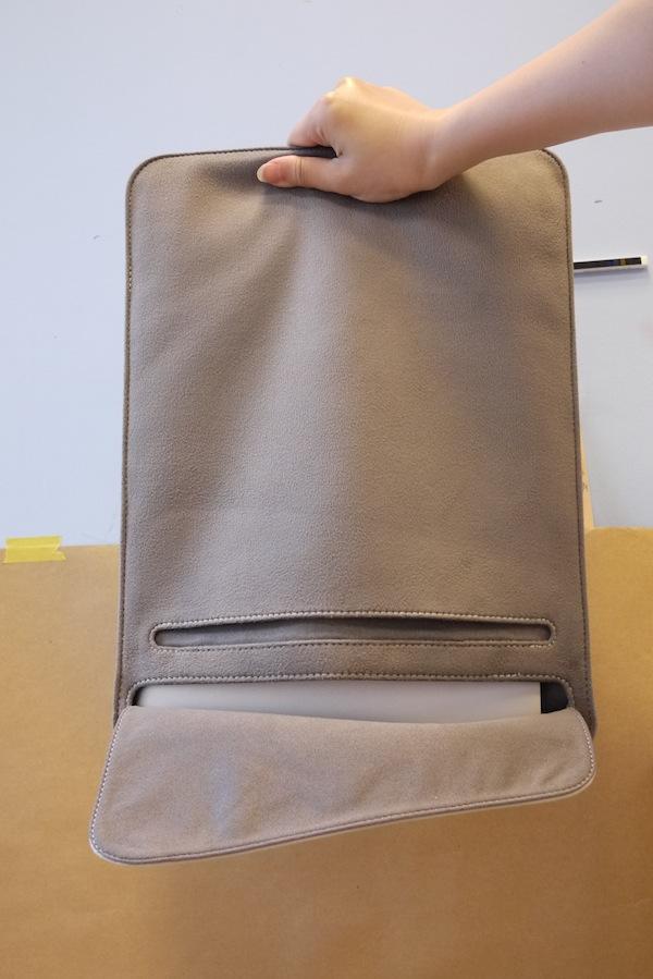 天啊!第一次見面就這樣倒著來,未免也太殘暴了~但為了測試防傾倒、防滑出的SlipGrip設計是不是真的那麼厲害,所以就硬著頭皮將自己心愛的MBA給裝進去,結果這麼一試,才發現真的沒問題呢!就算沒有任何拉鍊、磁鐵、扣環的裝置還是能將筆電牢牢的留在保護袋內(畢竟滑出來就沒辦法寫這篇文章了!),保護功能絕對不會因為極簡的設計風格而有所打折。