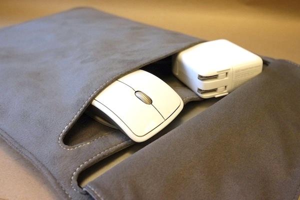 別懷疑,這裡頭真的裝了一台筆記型電腦~超輕薄的MBA搭配上超輕薄的muse保護袋,薄薄一片讓你幾乎忘了它們的存在。但可別因為它主打輕薄設計就看貓沒點(台),前方的袋子可是能輕易裝入MBA所附贈的變壓器和體積較小的滑鼠,肚量也還是有一定的水準,只是輕薄有型的目標就沒有辦法同時兼顧了。
