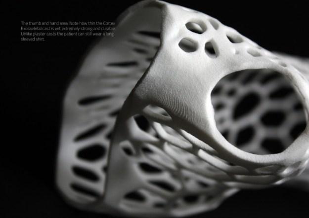 不知道你有沒有過骨折打石膏的經驗,不能透氣的石膏讓皮膚癢得像是螞蟻在上面築巢一樣,隔著石膏又沒辦法抓癢,那樣的痛楚實在是超級難受的。那,骨折除了打石膏之外,還有甚麼可以取代的呢?相信答案一定是有的。在全世界各地已經有許多醫療人員開始使用3D列印這項技術來製作義肢和骨骼,所以3D列印在未來能不能夠大量應用在骨骼重建上已經不成問題,那麼,對於較輕微的骨折患者當然能夠透過3D列印來幫助復原。最近畢業於紐西蘭維多利亞大學的學生Jake Evill提出了一個名為Cortex的概念,用來幫助骨折患者進行骨骼固定以加速復原的創意。
