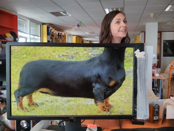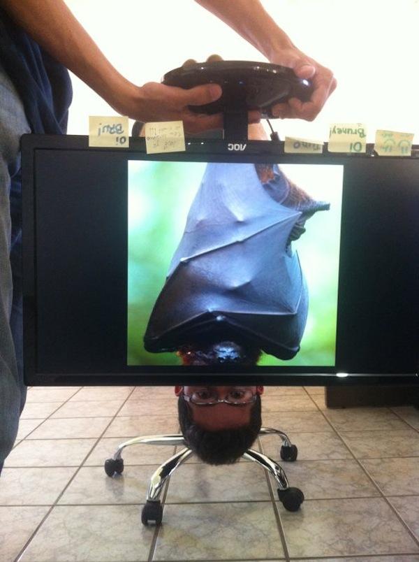 有些網友不只是單純的把自己頭借位到動物身上,還有更進階的技巧呢!像是頭髮跑到螢幕前(而且頭髮捲的剛剛好,XD),讓畫面更逼真,彷彿整隻狗狗都要衝出來了。而蝙蝠的難度更是數一數二的高,不但頭後仰的角度需要非常的大,再加上倒拿的螢幕還得遮住身體,光是創意與精神就非常值得嘉許啊~
