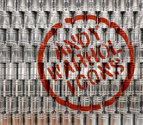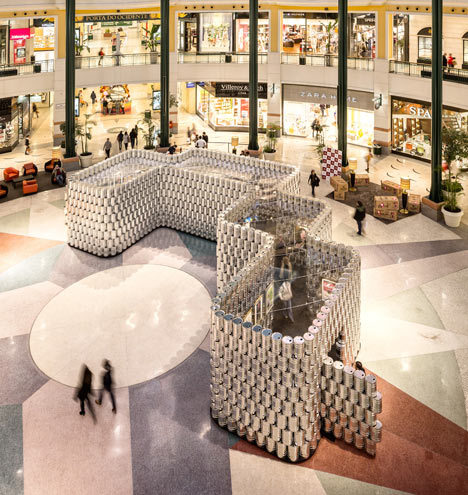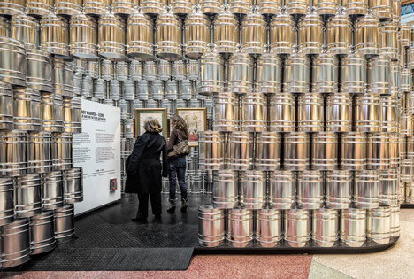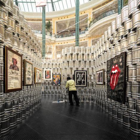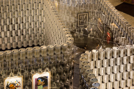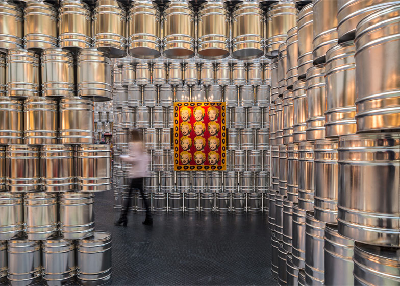 由 LIKEarchitects 策畫的「Andy Warhol---Icons | Psaier Artworks and the Factory」特展舉辦在葡萄牙首都里斯本的 Colombo 購物商場。該團隊希望可以表現出安迪沃荷趣味迷人的創作風格,所以不想用傳統的白板隔間,改以 1,500 個大金屬罐疊成展區,用來呼應傳說中知名的作品之一---"康寶濃湯" Campbell's Soup 罐頭,從高處俯看這些桶子塔實在很有趣,如果它們也能像畫作一樣統統貼上品牌紙標就更棒了!