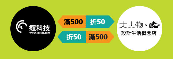 到大人物設計好物概念店消費滿 500 元---就送癮科技好東 C 賣場折價券 50 元