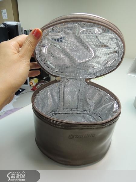 ↓上面那個小箱子打開後,是時尚 blingbling 的圓形提袋,老實說好像旅行化妝包哪~但其實是可以用來裝內鍋的保溫/保冷(可保溫 3 小時)便當袋唷!