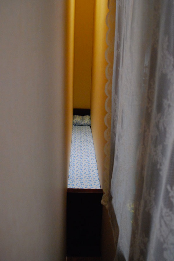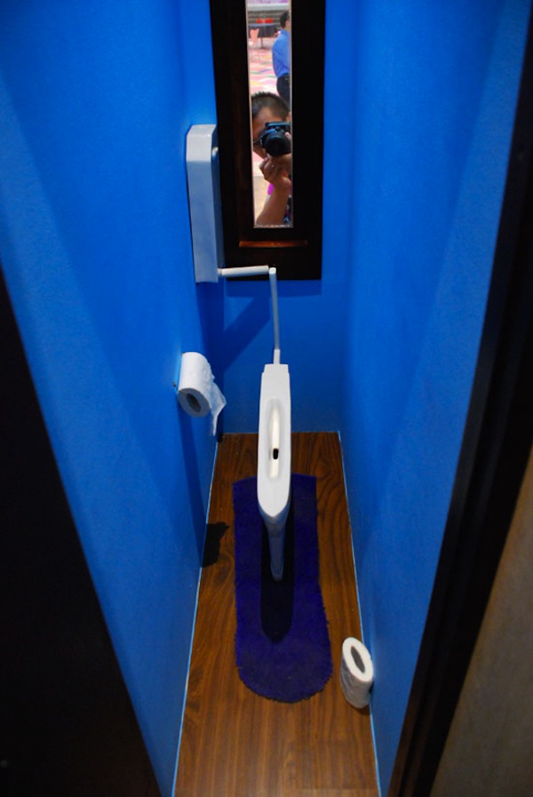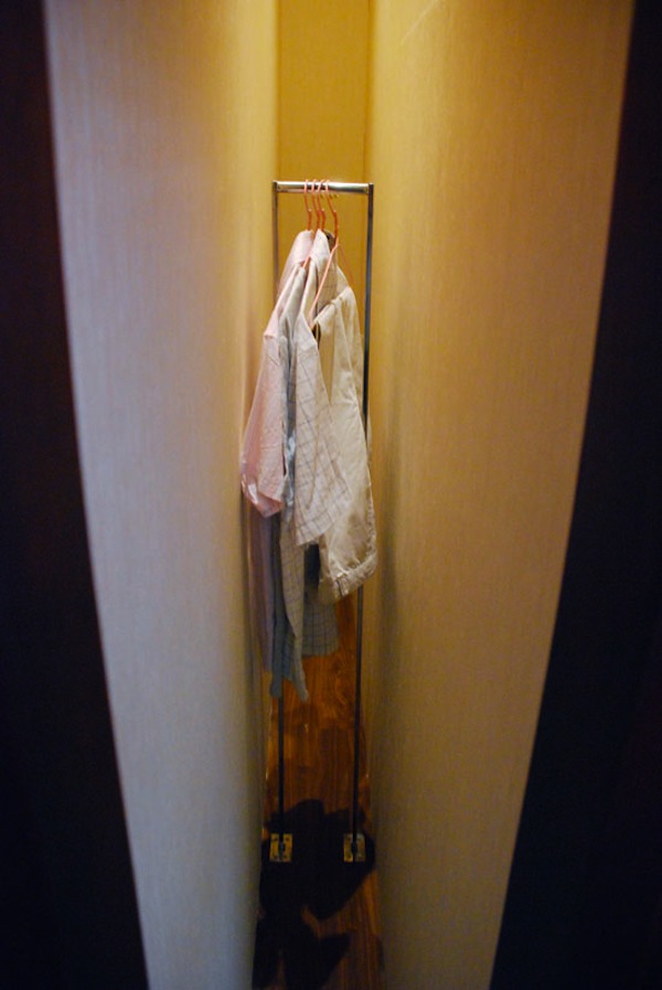 有些家具變型後看起來還 OK,例如浴缸、床鋪和書櫃等,但是有些就真的不堪使用了。這幢 Narrow House 是以 Erwin Wurm 的童年住所當作參考來建造,雖然 Erwin Wurm 只純粹想惡搞一下搏君一笑,倒不是想表達什麼深奧的人生哲理,不過在看到那個史上最扁的馬桶和只能掛三件襯衫的衣架後,內心還是不免有點惆悵阿!
