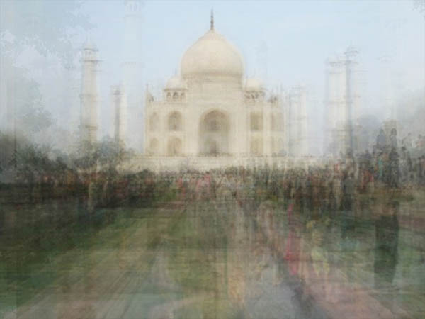 搭機越過千山萬水,當我們風塵僕僕地來到嚮往已久的世界名勝,導遊總會帶隊前往最佳拍攝地點,接著是讚嘆、驚呼、及不間斷的相機喀嚓聲。回國後我們迫不及待地將照片上傳,親友們總會羨慕地比起大拇指:「好美!簡直是明信片!」事實上,這些讓我們引以為傲的取景不只和明信片一模一樣,更與過往數以千計的遊客照片如出一轍。瑞士視覺藝術家 Corinne Vionnet 的系列創作,是最有趣的證明。根據不同地點,她蒐集兩百到三百張由不同遊客所拍的照片,將所有影像重合,得出了驚人的結果。泰姬瑪哈陵、巨石陣、金字塔……這些令遊子神往的地標變成了模糊的剪影,畫面中的場景不再是寫實的照片,反倒像壓克力繪畫創作、像油畫,甚至和印象派畫家莫內、畢沙羅的風景作品有幾分神似。