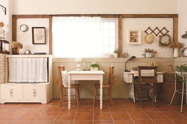 木傢具刷白增添手作味道 日式居住空間坪數不大,因此在日式鄉村風的營造上,也多以白色為基調,為的就是要空間看起來更乾淨、無壓。因而就連木傢具、櫃體,也多半會刷上白漆做表現,刻意不塗得太均勻,保留一點塗刷痕跡,一展典型日式風外,也帶出手作味道。