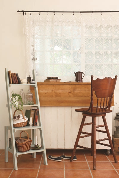 營造出最出色的自然風生活雜貨 想要讓日式鄉村風格更加出色,千萬不能忘了層架,掛於壁面或是用梯架做表現,它不單只是一項展示工具,而是成為佈置的另一個可用空間。在層架上可以擺放琺瑯餐具或是收納罐等,一展自然風生活雜貨,也把日式的放鬆、愜意感覺給帶了出來。