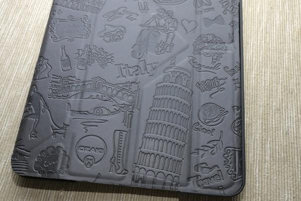 不同於封面的光鮮亮麗,保護套裡頭是低調的霧面灰色,只不過低調歸低調,該有的細節也是一點都不能馬虎,背後也有相同的精緻塗鴉花紋,而且從這一次看更能發現O!Coat Travel保護套的另外一個特色「雙向多角度Y型支架」。