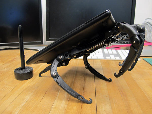 ▲就算是非常崎嶇不平的表面,也不會搖搖晃晃的,只要固定好爪架的長腿,讓腳尖能接觸到桌面,就算是幾乎沒有空位桌子也能擺得好好的