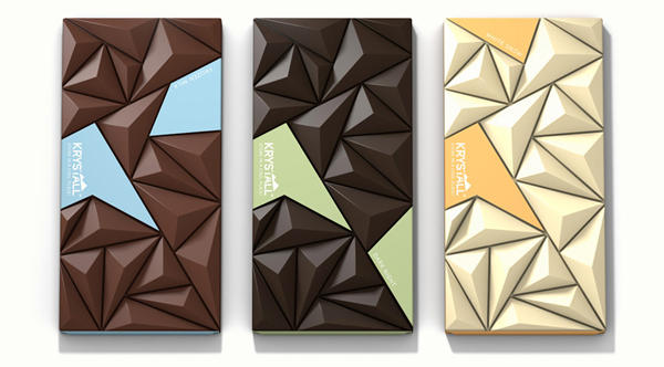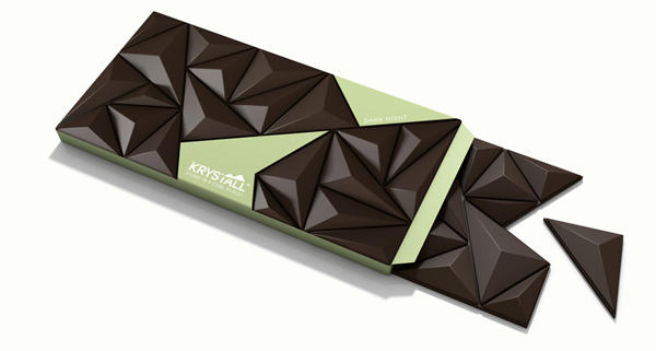 設計師 Riccardo Carlet 把巧克力變得不像以往我們看到的那樣,利用胡亂折斷的概念,把巧克力設計成整塊由三角形構成,這樣的靈感來自於冰山、冰塊、結晶體,並將包裝也設計成相同長相,讓巧克力變得具有設計感且方便食用。