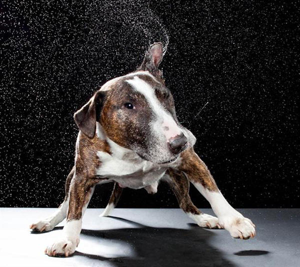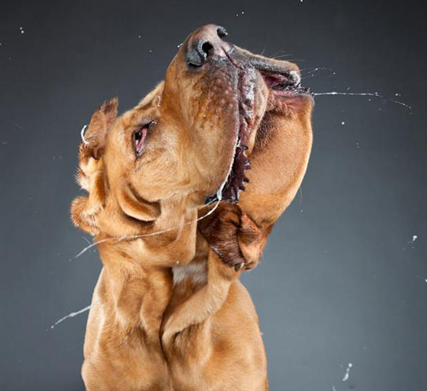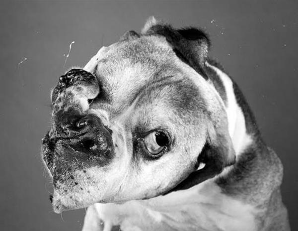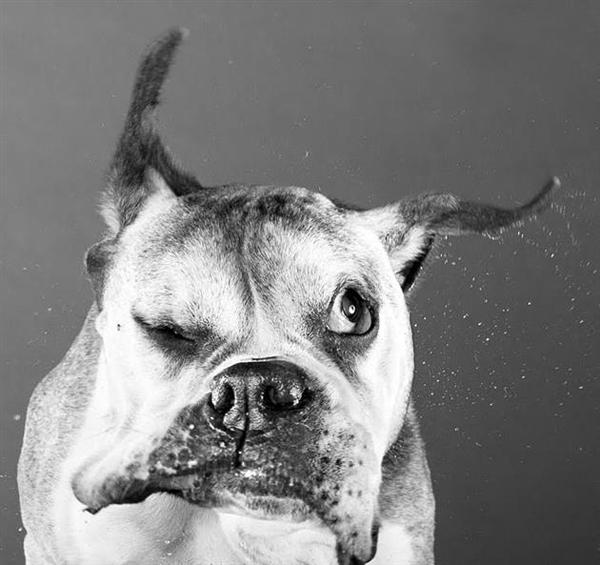 拍攝這系列攝影照片其實很不簡單,首先你要製造讓狗狗甩身子的動作,還要嚴防相機被口水噴得溼漉漉的XD,最後捕捉到的影像還必須沒有晃到才行,不用擔心這是虐待動物的行為,其實狗兒們根本動不動就猛甩身體的阿!