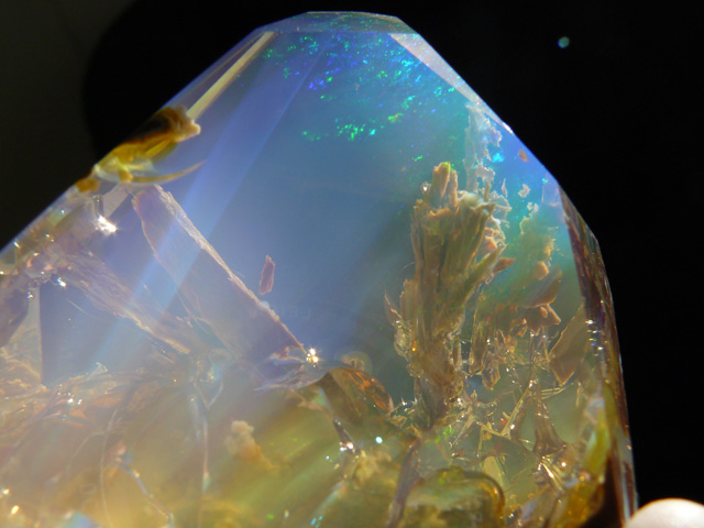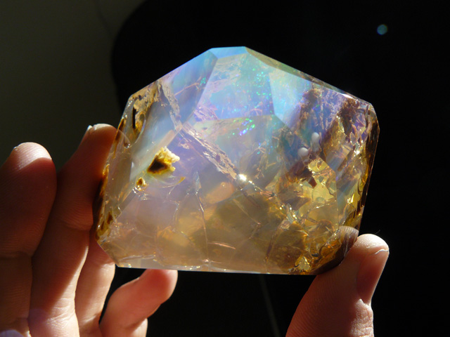 照片中的蛋白石是在乾燥的情況下所拍攝,根據賣家的說法,這顆蛋白石中所含有的水蛋白石成分,足以讓它在浸濕的情況下大幅改善透度,但在這樣狀態下的石頭看起來卻彷彿一座小小的海底美景,閃著七彩奇幻的曖昧光澤,可讓人有點捨不得將它浸濕阿!