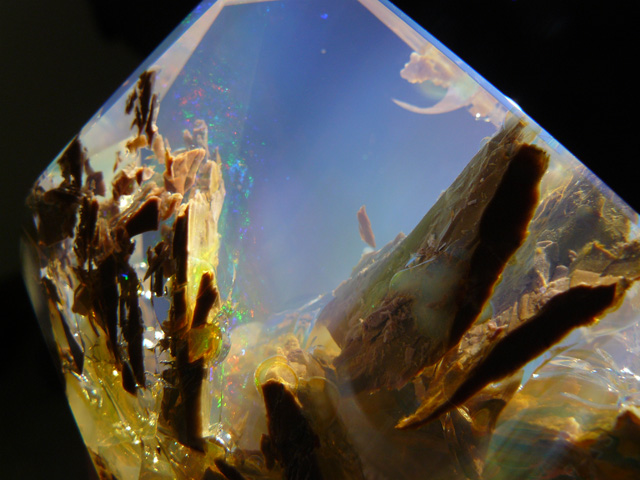 蛋白石又名貓眼石、閃山雲,其內部結構在在光線運作之下所形成的遊彩作用,往往在視覺上創造出無與倫比的七彩特效。而水蛋白石的顏色和透度,還會隨著乾溼程度而改變,當浸在水中時,水蛋白石的基色會變得十分透明,隨水分消失才慢慢變回原樣,整個過程大約可以持續幾個禮拜。