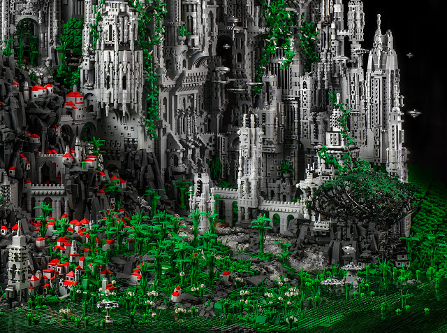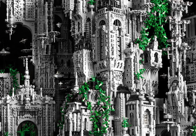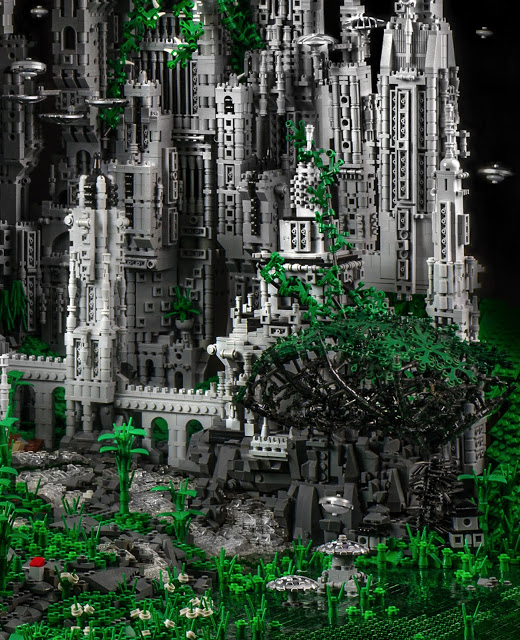 既古典又華麗的建築風格,大量綠色植物披垂在牆面上,看起來不像外星都市,反而像是一座佈滿歐式古堡群的獨立小島。《Contact Series》靈感來自於各種科幻外星電影,以約二十萬片樂高積木組成,除了有精緻繁複的結構之外,上頭漂浮的飛碟們也是亮點之一,花了超過 600 個小時創作,獨一無二的《Contact Series》算是 Mike Doyle 個人的封頂之作了,不過他向來喜歡用樂高挑戰各種特殊題材,像前年的樂高鬼屋也是花了六百小時的創作,不知道下個六百小時過後他還會端出甚麼菜呢!
