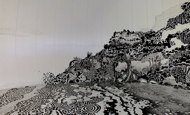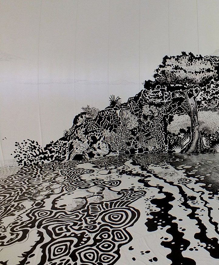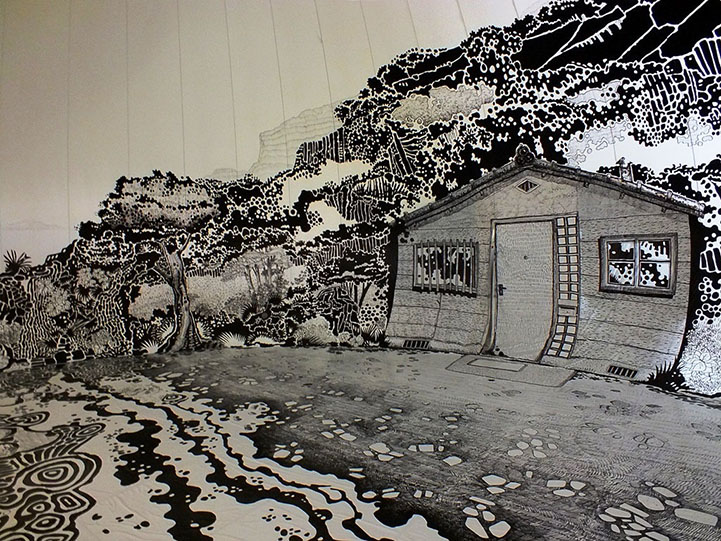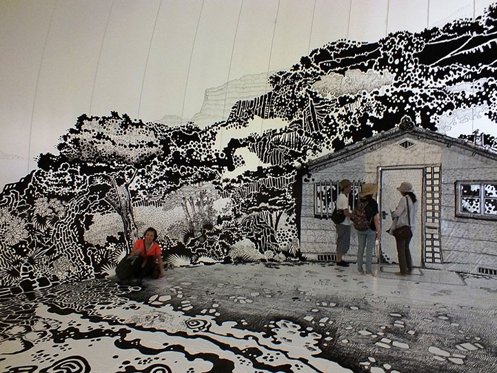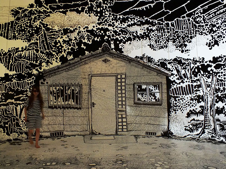 目前在日本瀨戶內國際藝術季中有個超酷的作品,巴西藝術家 Oscar Oiwa 用麥克筆畫出一幅室內海濱小島圖,範圍從牆面延伸到地板,有海浪、小屋和樹林,光著腳ㄚ走上上面超有FU,感覺下一秒就會有個戴著斗笠的日本老婆婆從屋裡走出來呢!