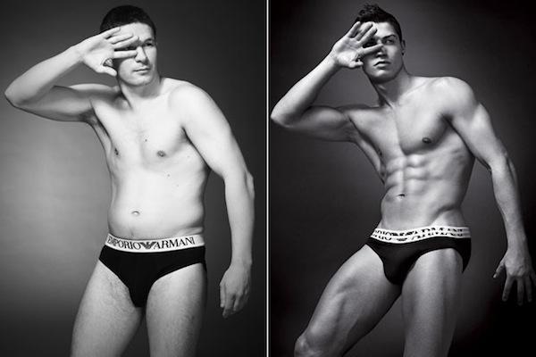 「封面照片僅供參考,實際商品以內容物為主」這句話不只能用在泡麵上,簡單改幾個字連內衣褲廣告也適用啊~英國太陽報找來幾位「平凡人」與帥氣的名人來個大比拼,看看誰比較有吸引力,同時也讓大家了解現實的殘酷!畢竟不可能每個人穿上這些名牌內褲就能變得跟運動球星與模特兒一樣帥氣結實,還是得讓消費者面對實際穿上去的樣子才行。(笑)