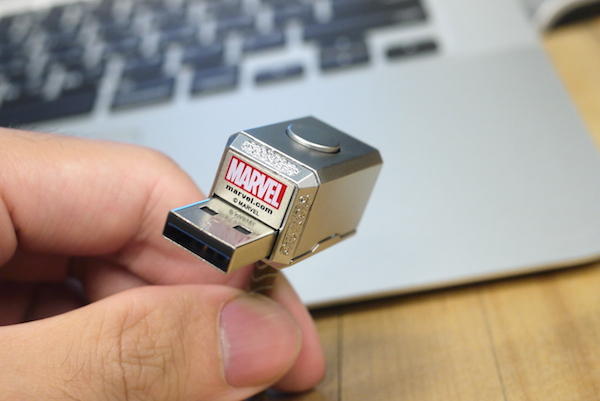 在認識新朋友之前,讓我們先回顧一下相當受到歡迎的經典之作吧~採用金屬製成的隨身碟握在手中能感覺到相當紮實的手感,有點沉又不會太沉的重量是屬於可以輕鬆帶出門的類型,上頭顯眼的紅色MARVEL大字證明了它的純正血統,證明這可不是從五金行拿來的普通榔頭喔~