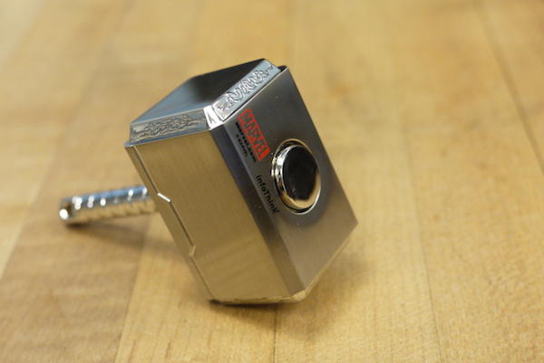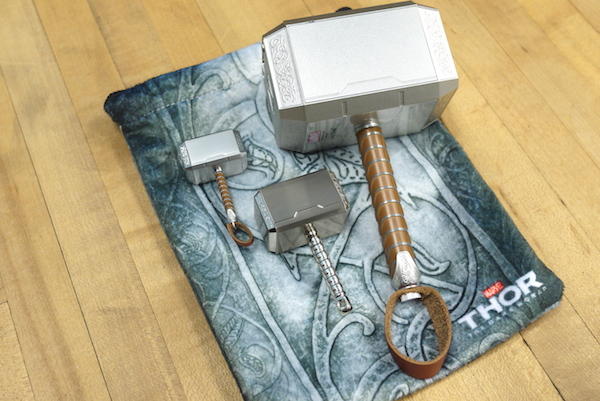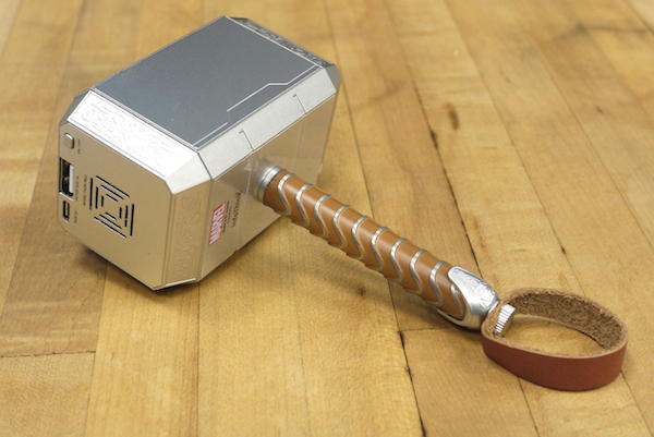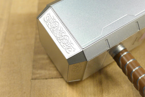 沒錯!最後的壓箱寶還是雷神之鎚,但這個塊頭明顯大上許多的傢伙可就不是隨身碟了,而是一款充滿神奇威力的行動電源!整體造型與新款隨身碟一樣,握把是經過塗裝的銀咖相間配色,底端也有畫龍點睛小皮繩,鎚子四周的圖騰刻紋因為體積放大數倍,所以精細度與呈現效果也變得更棒。