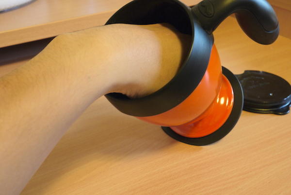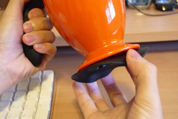 大家有注意到這兩張照片的差異嗎?第一張照片大編是準備直直的拿起不倒杯,而第二張照片則是稍微傾斜了一點,雖然差異不大,但這可是決定大家能不能把杯子拿起來的關鍵喔~因為不倒杯底下的橡膠墊與光滑平整的桌面間形成一個真空的狀態,就像黏在玻璃窗上的布偶吸盤一樣有著強大的吸力。而經過特殊設計的把手與杯身之間有些微的空隙,在垂直拿起的情況下可以讓少許空氣進入底部,讓真空狀態失效,如此才得以順利的將不倒杯拿起來。
