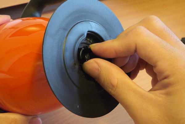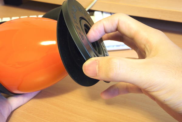 原來吸奇不倒杯的最大特色就是能牢牢的「吸」附住光滑桌面,無論大家怎麼推都能夠維持「不倒」的狀態,其關鍵就在它那大大的杯底設計。將吸奇不倒杯翻過來便可以看到一片上頭寫著使用前請先移除的保護殼,不用懷疑,只要像這樣輕輕的取下來即可。這時就出現一片軟Q彈牙,有著一點厚度黑色橡膠片,接下來跟著步驟走,就能知道不倒杯是如何發揮功力的。