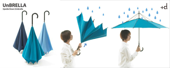 名為『UnBrella』的雨傘結構特殊,撐開時可看到外露的傘骨,收合的方向和一般雨傘相反,傘布向上收束後,只要將整隻傘倒立往地上放讓傘布上的水珠落下即可,h-concept 的設計師 Hiroshi Kajimoto 認為,這樣的設計主要還是為減少雨傘被風吹壞的機率,尤其是颱風天時,日本地鐵等公共場合常見到被吹壞的傘,UnBrella 被強風吹翻後,只要拉回來就又是一條好漢,另外收合後潮濕面向內,就不用擔心被濕答答的傘布會弄濕衣服或者雙手,聽起來確實頗禮貌貼心,而且整隻拿起來甩水時好像也會更順手!