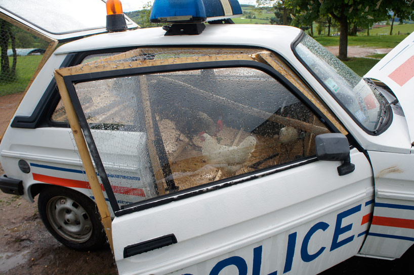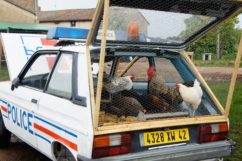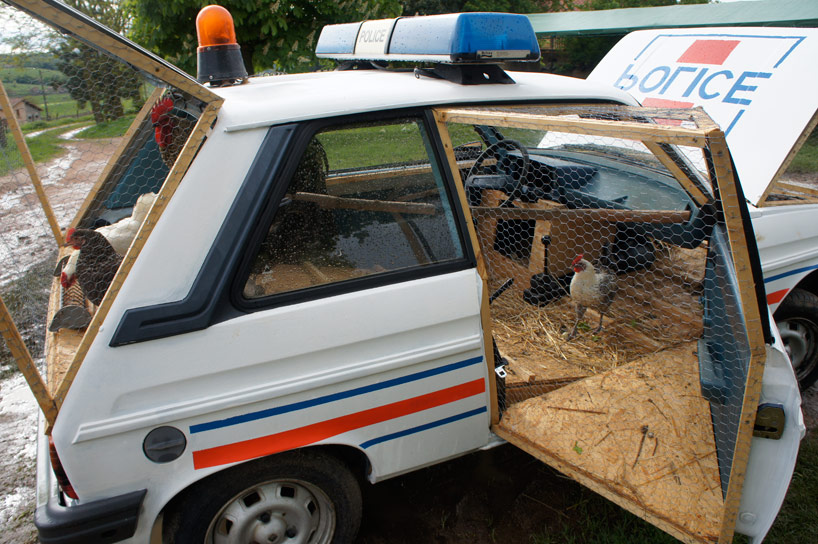淘汰的交通工具不一定得進入廢棄廠,只要有人願意動手改造就能發展出各種可能性,像這輛 1970's 的退休警車就被法國藝術家 Benedetto Bufalino 改造成雞舍,保留車體鈑金的部分,把車門、引擎蓋和後車廂蓋統統打開通風並加裝鐵絲木框,內部則針對雞的生活需求改造成舒適的居住環境,相當幽默的創作手法讓這輛舊警車有了人人稱羨的退休生活,似乎也是美事一樁喔XD