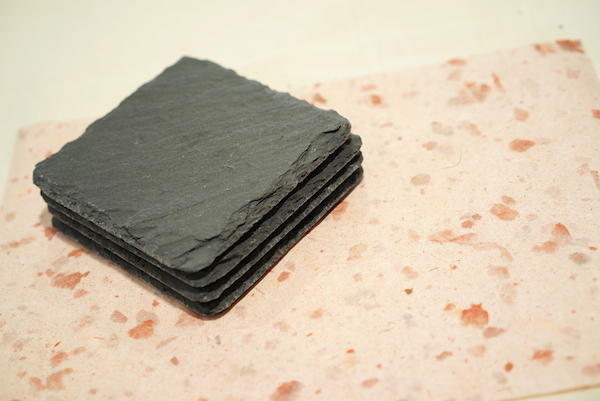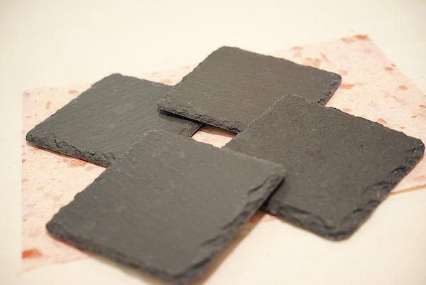 一組四片的杯墊是個個都長得不太相同,因為天然形成的礦物原本就難以控制其中的紋路與色澤,有點粗糙不平整的表面保留石材本身的質感,邊緣的刀痕更是頁岩開採加工的一大特色,當使用者拿到每一塊杯墊的時候都能大聲的說這是世上獨一無二的杯墊。