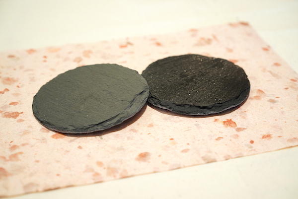 原本呈現深灰色的頁岩杯墊在碰到水之後會變成更深沉的黑色,(因每台電腦螢幕顯示設定不同的問題,故杯墊顏色以實物為準),天然的石材有吸收水份的能力,但並非一滴下去就消失的無影無蹤,所以當咖啡或茶飲料灑在上頭的時候,只要立刻擦拭乾淨,或用清水沖洗,即可以避免在上頭留下痕跡。