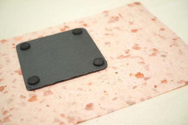 拆開麻繩後的杯墊們整齊排列著,真的有種石板屋的風味!但眼尖的人們應該有發現到杯墊與杯墊中間有著一小段空隙,而這個空隙可是有它存在的道理在,且聽大編娓娓道來~因為頁岩同時具備著堅硬與脆弱的特性,所以設計師在杯墊底部加裝了數個小泡綿墊可以防止堅硬的石材直接碰觸桌面造成刮傷,也因為這些小泡綿墊,讓杯墊在疊羅漢的時候不會互相碰撞而破損,最後要提到的功能,當然也包括幫助杯墊增加止滑效果囉。