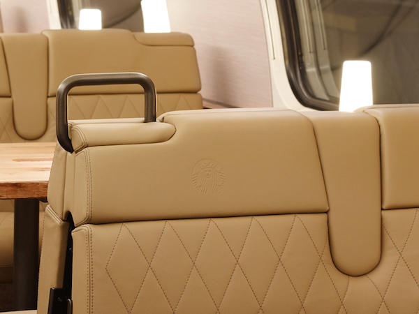 列車裡頭的裝潢不只是講求坐起來舒服、看起來美觀,就連配色上也要讓乘客彷彿置身於咖啡世界裡。溫暖厚實的原木桌面不漆上其他色彩,僅以亮光漆保護,呈現出木頭原本的質感。拿鐵色的真皮座椅是專門為這台列車所設計製作的,上頭還印有星巴克的經典標誌,如果是忠實的星巴克迷應該會希望他們推出類似的周邊商品吧~(笑)