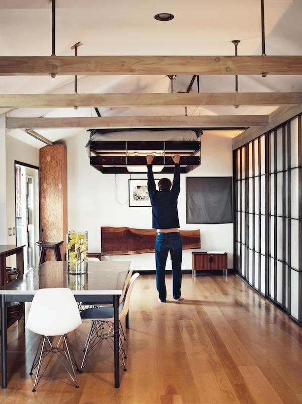 沒了床鋪,整個房間看起來更加清爽寬敞,朋友到家中拜訪也不再擔心擁擠的問題。設計師更貼心的在床鋪底部加裝上電燈,原本貼在牆面上的木板也能放下來當桌子使用,最後再拉張椅子,簡直就像咖啡廳裡的裝潢一樣。設計師發揮巧思把節省空間的任務變得很時尚,同時不需要犧牲睡眠空間換張小床鋪,住在小空間裡也能有大享受啊!(但大編還是忍不住擔心四邊的鋼索,看起來真的有點危險,如果能做成拆卸式收上去就太棒了~)