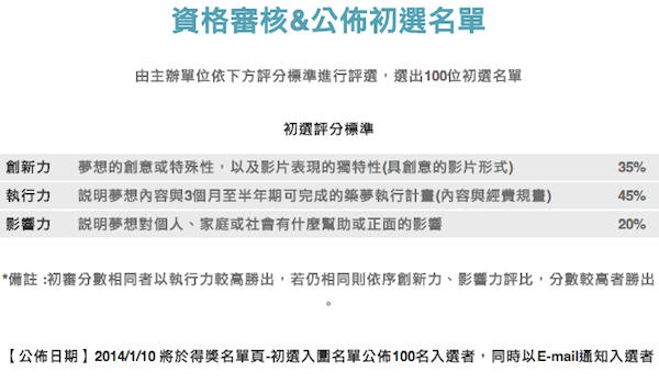 主辦單位預計在明年(2014年)一月中旬公布初選名單,從人海茫茫的報名者中選出100組創意與實力兼具的入選者進入第二階段。而這100個團隊或個人都各可以接觸到一台貨真價實的全新ECOSPORT,因為參賽者得利用ECOSPORT來展現自己的決心,記錄自己如何用免費的ECOSPORT48小時試駕機會,為自己的計畫暖身、準備,更重要的是拉票啊!