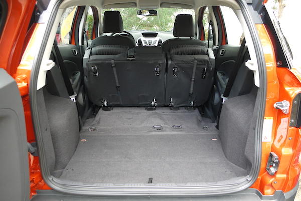 到山上沒景色看沒關係,更重要的任務是帶大家認識ECOSPORT的特色與貼心設計,那我們就先來看看後面與車內空間吧。像是側開式後車門就是為了身材嬌小的駕駛所設計,讓大家不用為了去拉那高高上的休旅車後車門而把手伸的長長長。而後車廂的空間在座椅摺疊的情況下,完全是大到驚奇,足足有705公升的容量,裝朋友,OK!裝露營器具,OK!甚至連搬家需要塞小冰箱,洗衣機進去也都OK!