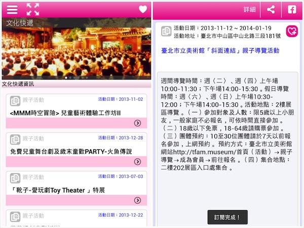 首先要介紹的是最新版本所新增的內容(11月27日所發佈的版本,還沒更新的朋友趕快下載一下吧!),這次最棒的、最豐富的更新內容絕對非休閒娛樂中的「文化快遞資訊」莫屬了!在這裡頭可以找到各式各樣的優質娛樂活動,例如:親子活動、城外行腳、電影瞭望、音樂現場…等分類,每點進一則訊息,都能看到詳細的活動資訊與報名方式,更貼心的是多了訂閱功能,讓使用者看到好訊息立刻將它們存進收藏中。