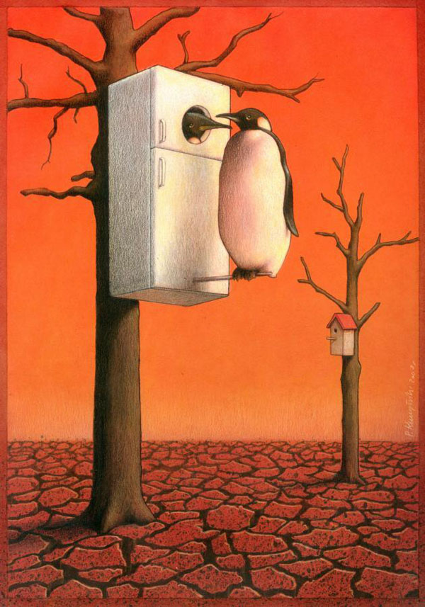 當今諷刺批判時事的漫畫非常多,然而如波蘭畫家 Pawel Kuczynski 這樣溫暖柔和卻又飽含深意的,卻不常見。