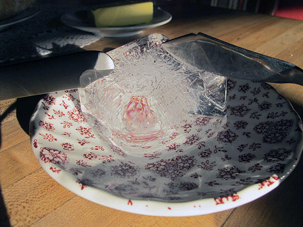 在正式切奶油之前,我們先來切切冰塊,比起奶油,就算是很利的刀也未必能夠把冰塊切開,但是奇想奶油刀幾乎不用用力,只要把刀放上冰塊,也不太需要出什麼力氣,刀子就會緩緩地與地心引力配合慢慢地把冰塊切開,相較一般的奶油刀只是靠在冰塊上許久依舊聞風不動,奇想奶油刀完勝!