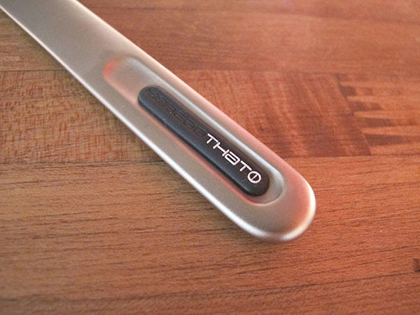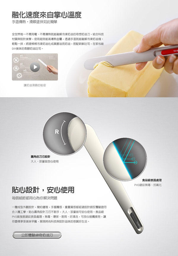 這隻刀最不一樣的就是不需要用電,也不用先加熱或先導電,只要握住刀子過不了多久,手心的溫度就會緩緩的傳導到 你心中 刀身,透過手溫就可以輕鬆融解鐵石心腸般的奶油塊,甚至利用刀上的溫度輕鬆把奶油均勻地抹在吐司上。