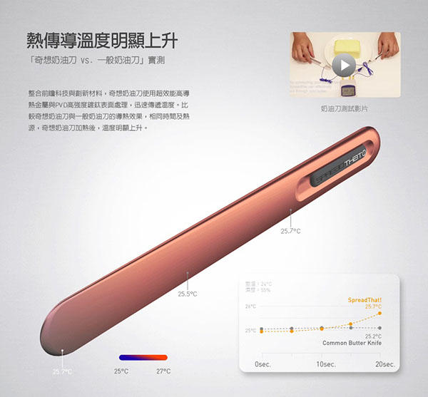 也許也有相同困擾的奇想團隊,設計出了一款名為「奇想奶油刀」的刀具,讓奶油就像是燉了三天三夜的豬腳一樣觸刀即化,先看看外觀就與普通的抹刀非常不一樣,刀身很薄但很好握,沒有曲線的設計讓刀子看起來還滿時髦的,加上尾端的防滑橡膠握柄,想挖取奶油時就不會有奶油挖著挖著刀就飛出去的情況發生 。