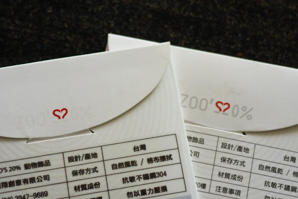 ZOO'S 20% 的外包裝有兩種設計,深色的同心圓紋路是花樣較繁複的款式,也就是有同心圓、愛心和穿鞋子的設計,而另一種比較簡約只有外框的款式則是淺色包裝,從外包裝就能辨識。