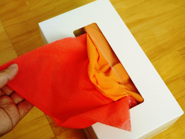 這個「七寶面紙」由日本加工紙製品『大昭和景泰藍 First』研發生產,打開包裝會看到第一張飽滿紅色的面紙,接著一抽接一抽,會依序出現橘色、黃色、綠色...等彩虹七色,從外觀上包裝盒是一片白,但盒子內裏也塗裝上了滿滿的彩虹色系非常漂亮,而且據說他們家出產的衛生紙比一般的還要柔軟喔!