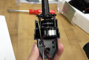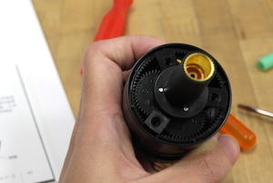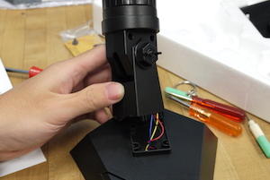 接著把馬達與齒輪的組合蓋上含有電源線的燈泡座,並以主軸包覆在外,最後再鎖上支柱就搞定。雖然聽起來點抽象,但大家只要記得兩個小細節便可以輕鬆面對,一是將電源線們從缺口拉出,並扣在固定的卡榫上;二則是確認傳動軸是否有通過燈泡台座的兩個孔,對齊之後就可以放心的鎖上螺絲。