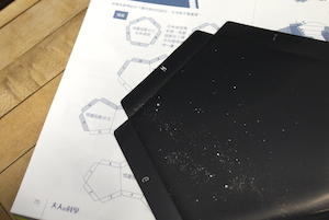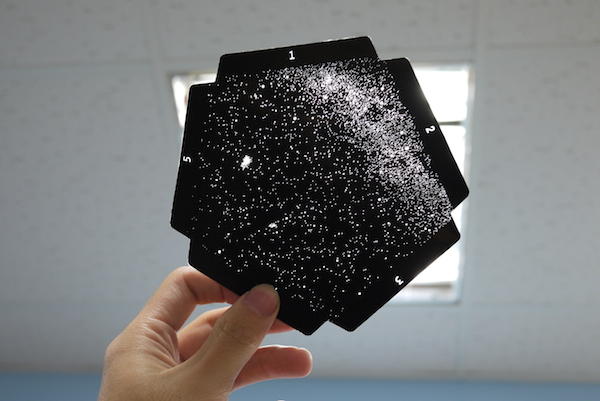 恆星片的組裝倒數第二步驟就是將裡頭的附贈的黑色膠貼滿「所有」的留白處全部貼滿,目的是為了讓光線不要從連接的細縫中透出,產生不必要的投影圖形。如果已經有朋友組裝完成,就會明白右圖裡的黑色貼紙用完有多麼令人開心!