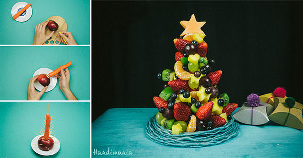 首先你要準備各色當季水果,台灣現在一年四季都有不同季節的水果可以吃,冬天盛產橘子、棗子、草莓、柳丁等等,還要多準備一個奇妙的蔬菜:紅蘿蔔,主要是用來固定附著在外部的水果們,接著把水果們切丁,或是利用模型刀把水果們切成星星、愛心等可愛的形狀,最後利用巧手把水果組裝好,端上桌,就是超正點的聖誕樹了!