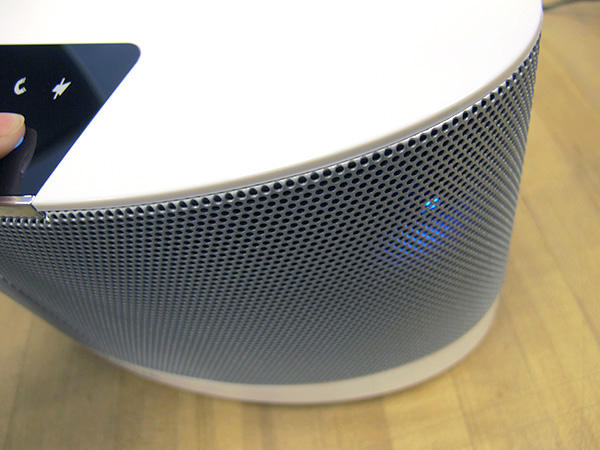 當關機狀態時,電源鈕會發出紅光,輕輕點下,預設的藍牙與音量大小鍵會立刻發出藍光,用光線區分該功能是否正在作用。其中的「AUX」鈕即是當連接電腦等當作外接式電源時便會發出藍光,右邊一點的電話圖示非常厲害,如果你把音響連接上手機,不只可以當作揚聲器,甚至可以對著音響通電話啊!內建麥克風的設計就算你正播放手機裡的音樂時有來電,也會立刻切換,當通話結束時,音樂會立刻恢復播放,真是太貼心了。