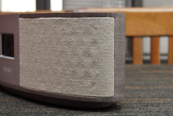 《書之語》有深淺兩種不同的木色,偏灰的科技木像是沉穩的熟齡型男、另一款偏紅的櫻桃木則充滿早期懷舊風情,配上中性棉麻布料的音箱布,屬於相當耐看且愈陳愈香的組合。
