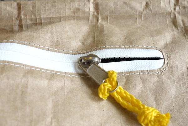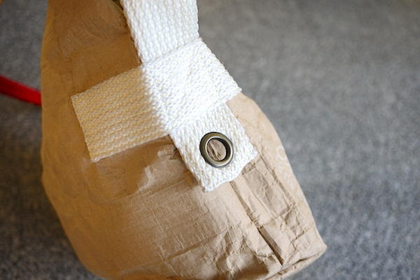 不知道大家有發覺背帶有什麼不太一樣的地方嗎?原來背帶上頭的彩色織帶從黃色變成紅色了!這是三款紙背包的設計中唯一鮮豔的色彩,雖然這兩色織帶所佔的面積不大,不過有種畫龍點睛的效果,不會搶走包包的重點,恰如其分的點綴著。